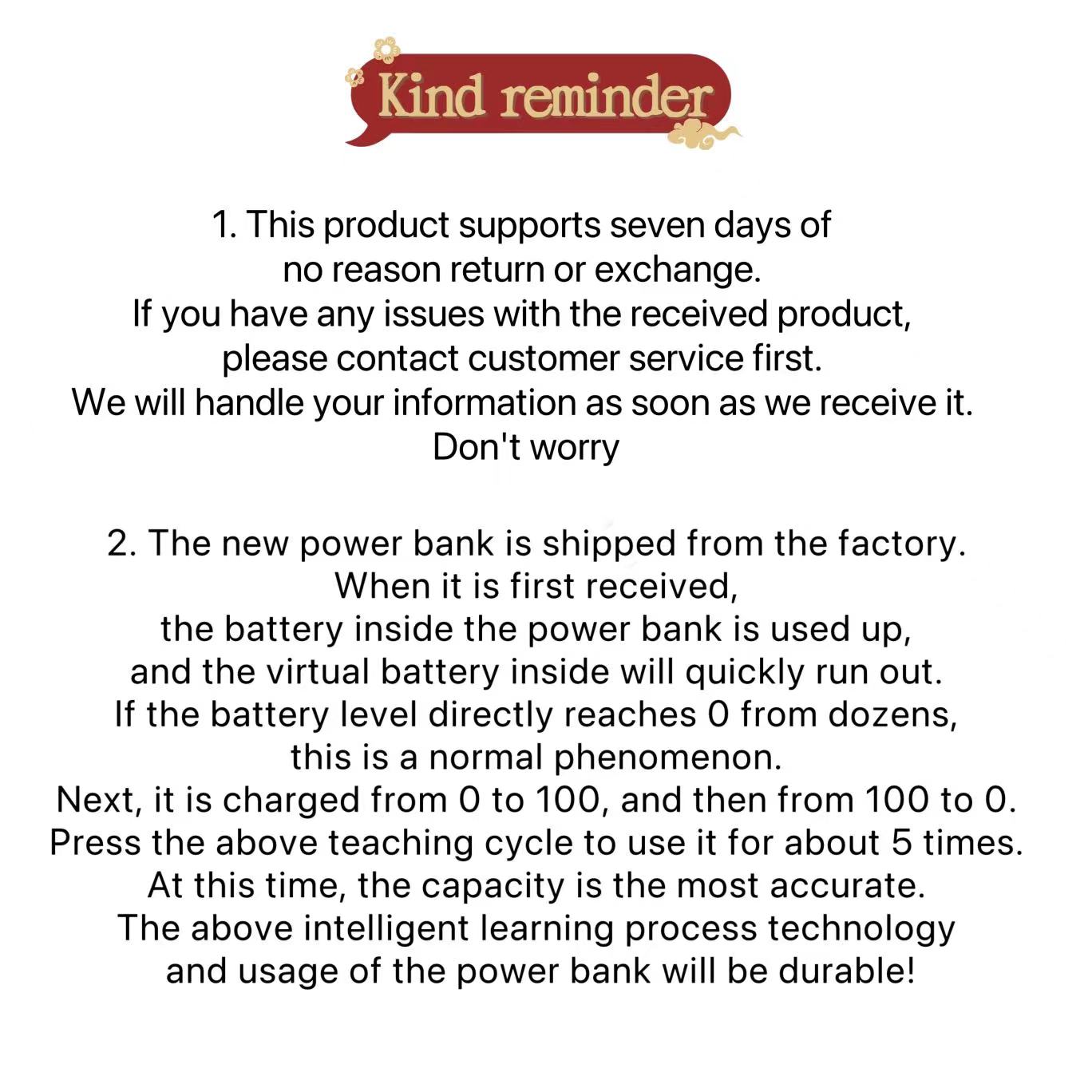 Warm reminder for the new power bank to start charging and testing. If you receive the battery, first use up the factory's bay type battery. [Virtual battery will quickly run out, and if you use it from a few tens • 0 this is a normal phenomenon] Next, charge from 0 to 100, and then use it from 100 to 0. Use the above tutorial loop for about 5 times. At this time, the capacity is the most accurate, and the intelligent learning process and usage of the power bank's battery technology will be durable!