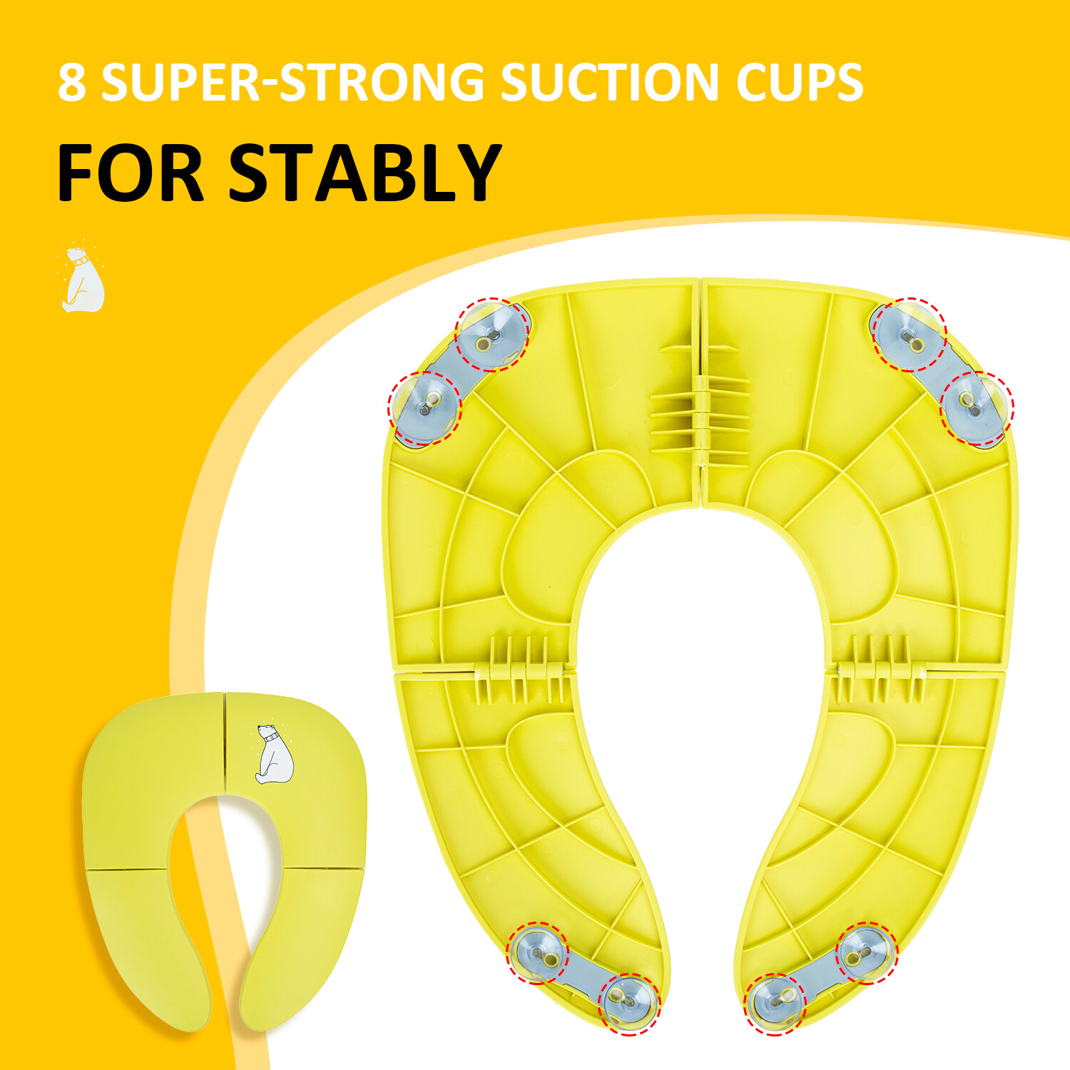 It has 8 suction cup grips around it to ensure you child is secure as possible while learning how to use the bathroom.